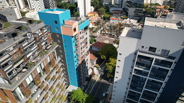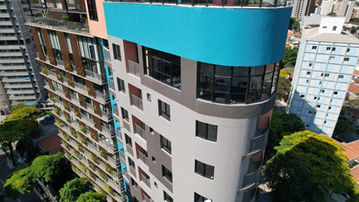 Esta situação urbanística foi uma grande inspiração. Nossa proposta foi compor com apartamentos de 1 dorm de 1 e dois pavimentos (duplex). Apresentamos uma paleta de cores alegre, com azul e laranja em composição com uma base cinza e preta.