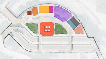 Sobre a laje, projetamos uma ampla cobertura que abriga usos complementares à praça: lojas, restaurantes, sanitários, espaço para eventos, playground e área pet — transformando um espaço técnico em um ambiente ativo e multifuncional.