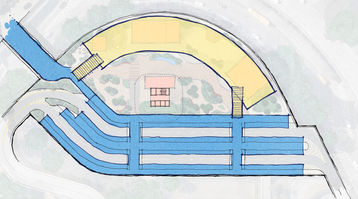 A intervenção ocupa a cobertura do edifício garagem existente, até então subutilizada. Para viabilizar o novo uso, foram projetadas rampas independentes de entrada e saída, garantindo fluidez operacional e segurança. A nova praça concentra e redireciona o fluxo de passageiros para um ponto estruturado, reduzindo conflitos viários e melhorando a dinâmica do entorno imediato do aeroporto.
